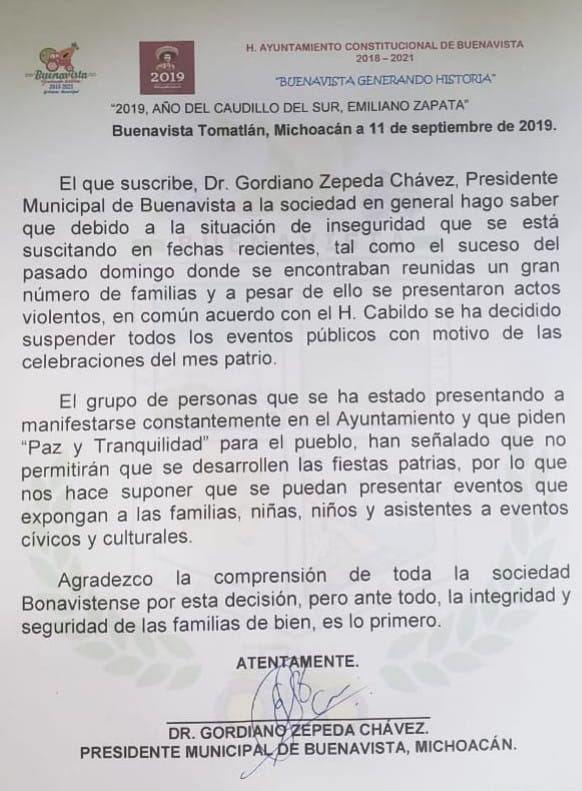 Bueavista, Tomatlán, Mich., a 11 de Septiembre del 2019,- Con el Respaldo de los diversos sectores de la Población y atendiendo las peticiones de la ciudadanía, esta mañana el alcalde Gordiano Zepeda Chávez dio a conocer que por acuerdo de cabildo y por seguridad de la población se suspenden todos los actos públicos relacionados a las festejos patrios.