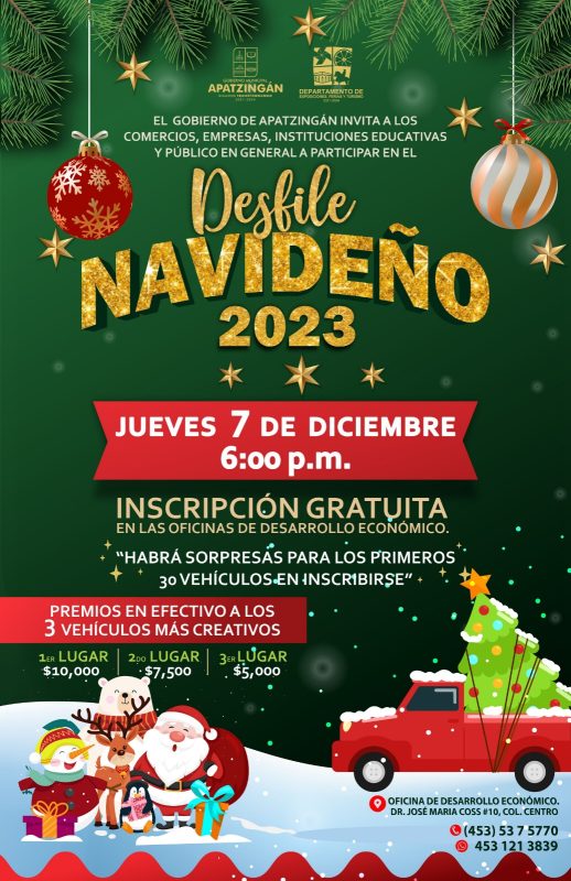 Apatzingán, Mich.- a 15 de Noviembre del 2023.– El gobierno municipal a través de la dirección de Exposición, Ferias y Turismo anunció el desfile navideño 2023 el próximo 7 de diciembre a las 18:00 horas, este año incrementó la bolsa de premios para los tres vehículos más creativos obtendrán los tres primeros lugares $10,000 mil pesos, $7,500 mil pesos y $5,000 pesos respectivamente, por lo que las autoridades invitaron a inscribirse y recibir la víspera navideña.