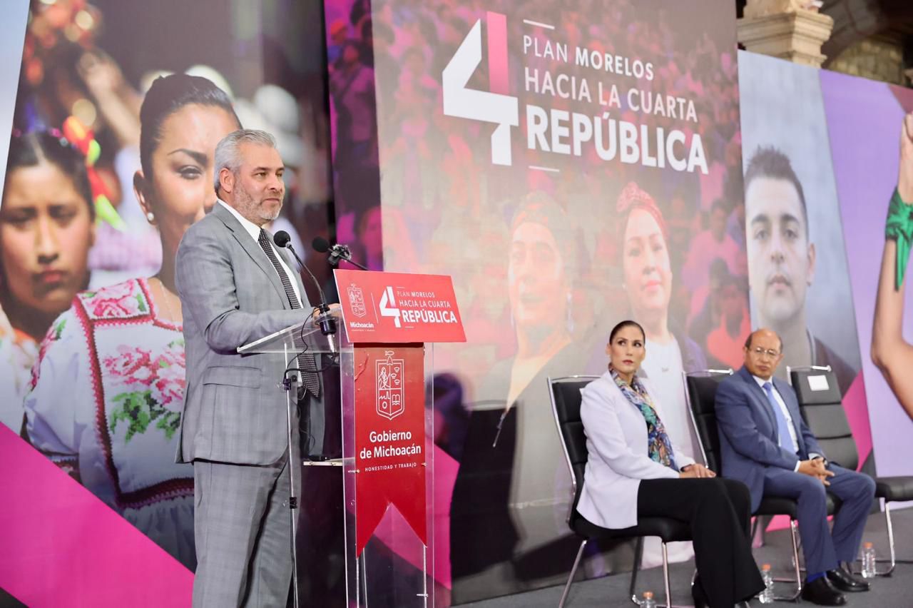 Morelia, Mich., 2 de Septiembre de 2024.- El gobernador Alfredo Ramírez Bedolla presentó el Plan Morelos, el cual contempla la propuesta de cinco reformas a la Constitución de Michoacán en materia indígena, elevación a rango constitucional de los programas sociales, para la democratización y presupuesto pleno de la Universidad Michoacana de San Nicolás de Hidalgo, reconocimiento de los derechos de las mujeres a decidir sobre su cuerpo, y derechos y responsabilidades medio ambientales.