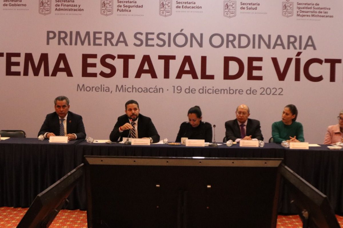 Morelia, Mich., a 20 de diciembre del 2022.- Con la representación del gobernador del Estado, Alfredo Ramírez Bedolla y del secretario de Gobierno, Carlos Torres Piña, la subsecretaria de Derechos Humanos y Población, Elvia Higuera Pérez, encabezó la Primera Sesión Ordinaria del Sistema Estatal de Atención a Víctimas.