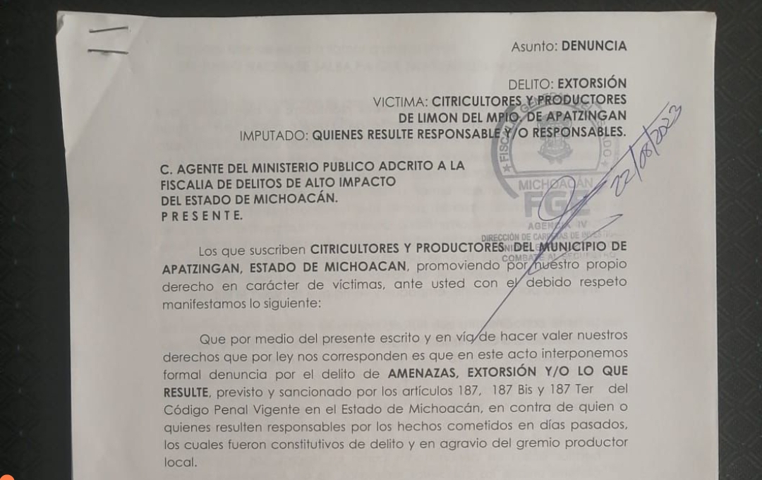 La querella fue presentada formalmente ante la Fiscalía General del Estado (FGE), misma en la que describen los hechos constitutivos de delito en los que narran los sucesos descritos por los citricultores de la región.
