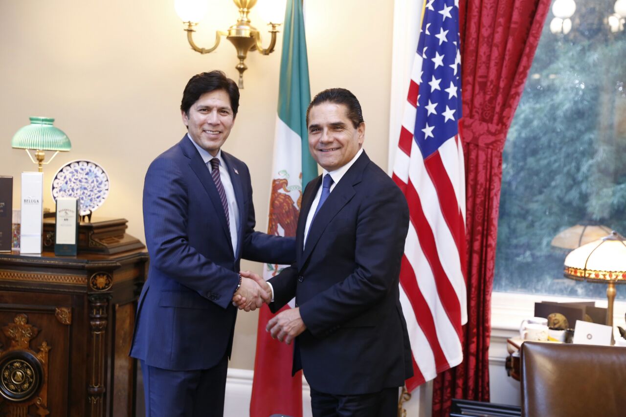 Sacramento, California, a 14 de febrero de 2017.- Como parte de la gira de trabajo que lleva a cabo en Estados Unidos, la tarde de este martes el Gobernador de Michoacán, Silvano Aureoles Conejo, se reunió con el presidente del Senado de California, Kevin de León, con quien acordó la implementación de acciones conjuntas a favor de los migrantes.
