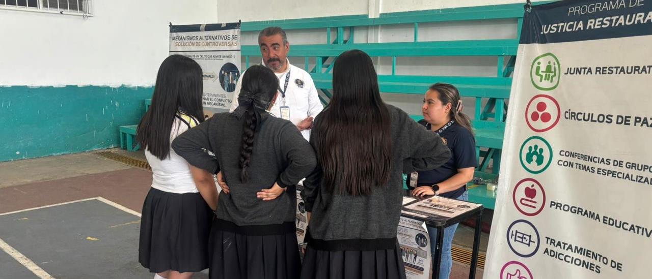 El titular del CMASC, Alejandro Villaverde, en compañía de personal adscrito a la Dirección de Programas de Justicia Restaurativa, acudió al centro educativo para promover los Mecanismos Alternativos de Solución de Controversias (MASC) y los Programas de Justicia Restaurativa, como herramientas eficaces para la atención y resolución de conflictos mediante el diálogo, la mediación y la conciliación.