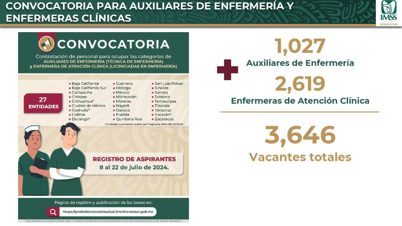 Precisó que la convocatoria es para ocupar plazas en 27 entidades porque también se incorporan los tres estados donde existe el modelo IMSS-Bienestar, antes conocido como IMSS-Coplamar.