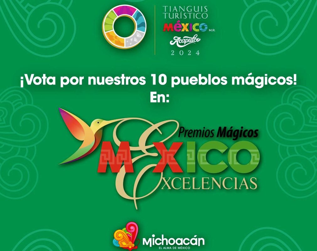 Morelia, Mich, 27 de Marzo de 2024.- Las riquezas y atractivos de Michoacán siguen destacando a nivel nacional e internacional y en esta ocasión el estado suma otra nominación, ahora para los Premios Mágicos por Excelencia, los cuales serán entregados en el marco de la edición 2024 del Tianguis Turístico de Acapulco a realizarse en abril.