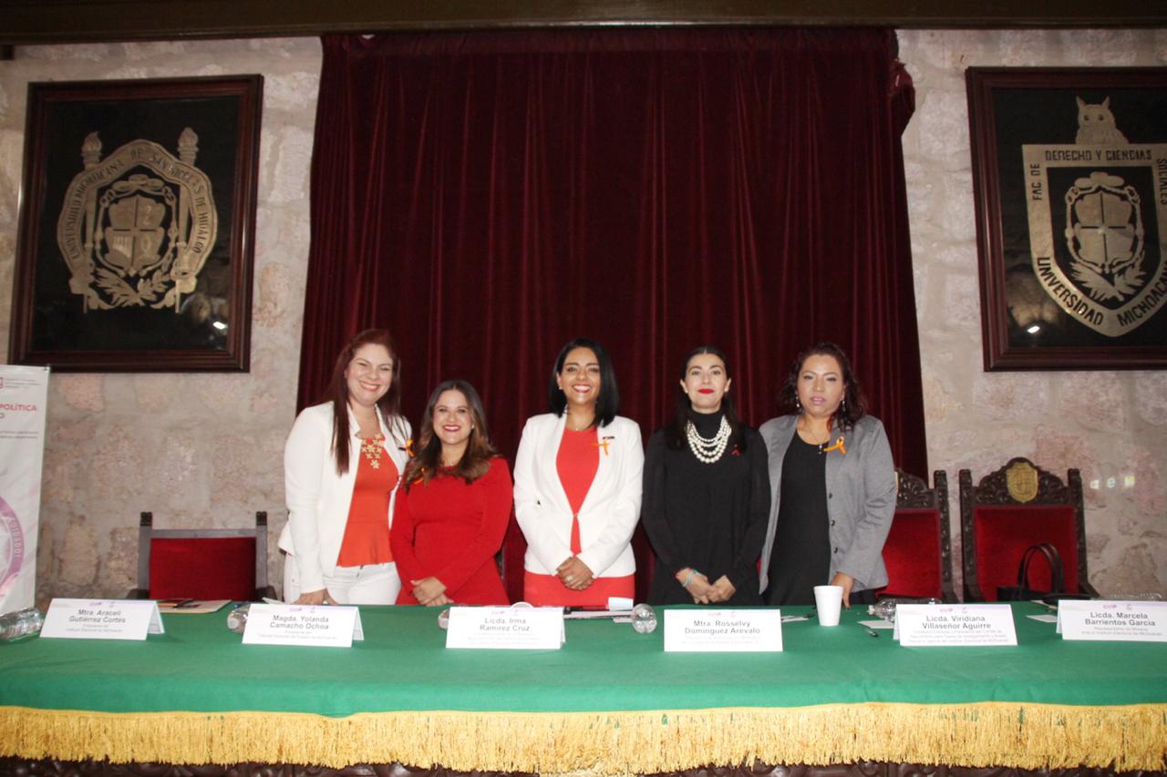 Morelia, Michoacán a 25 de Noviembre de 2019.- En el Marco del Día Internacional de la Eliminación de la Violencia en Contra de las Mujeres tuvo lugar el Conversatorio Avances y retos para Garantizar una Participación Política libre de Violencia” organizada por la Comisión de Derechos Humanos del Instituto Electoral de Michoacán (IEM), en la que participaron la Mtra. Araceli Gutiérrez Cortés, Presidenta del instituto Electoral de Michoacán, la Consejera Viridiana Villaseñor Aguirre; la Magistrada Presidenta, Yolanda Camacho Ochoa; la Consejera Rossvely Domínguez Arévalo, Presidenta de la Asociación Mexicana de Consejeras Estatales Electorales A.C.; la Lic. Marcela Barrietos García, Representante de Morena ante el IEM, así como la Consejera Irma Ramírez Cruz, como mordedora.