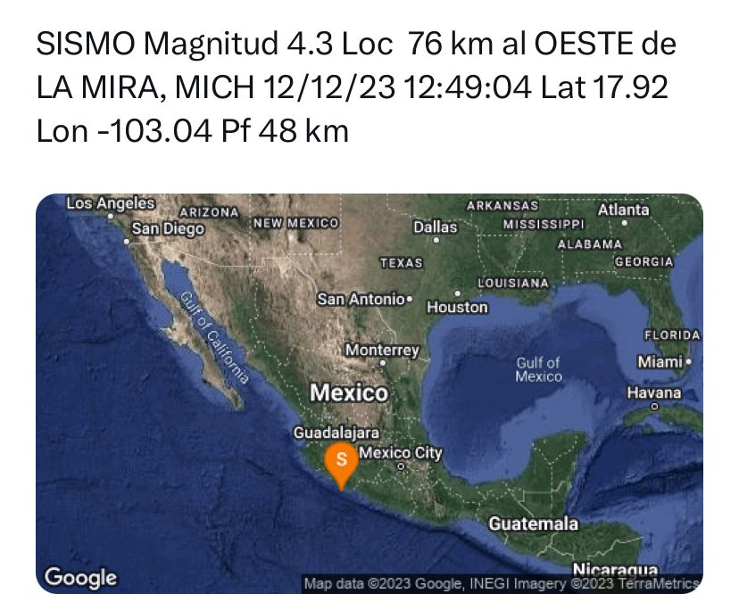 Morelia, Mich., 12 de Diciembre de 2023.- La Secretaría de Gobierno, a través de la Coordinación Estatal de Protección Civil, mantiene atención y monitoreo constante tras el sismo registrado al oeste de La Mira, municipio de Lázaro Cárdenas, con una magnitud preliminar de 4.3, del cual no se registran afectaciones.