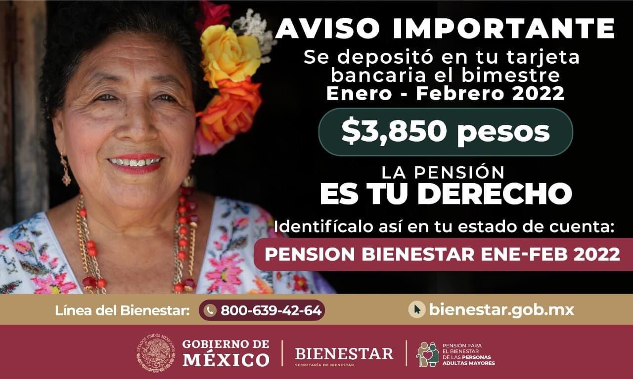 Ciudad de México, a 14 de Enero del 2022.- La Secretaría de Bienestar lleva a cabo la dispersión en todo el país de la Pensión para el Bienestar de las Personas Adultas Mayores, la Pensión para el Bienestar de las Personas con Discapacidad y del Programa de Apoyo a Niñas y Niños Hijos de Madres Trabajadoras, correspondiente al bimestre enero-febrero.