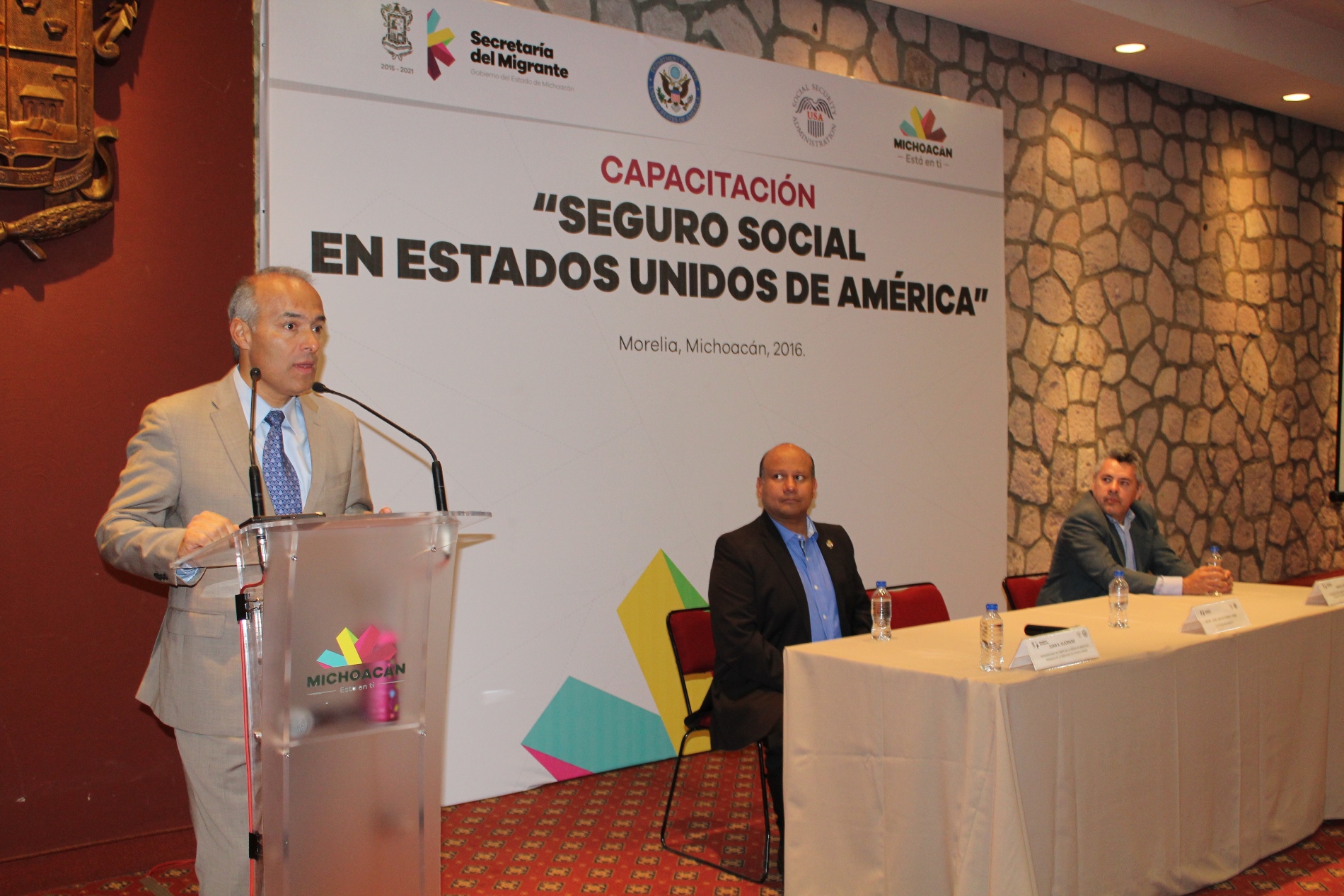 Morelia, Mich., a 12 de mayo de 2016.- La Secretaría del Migrante (Semigrante), en coordinación con la Embajada de Estados Unidos en México, inició una campaña de 10 capacitaciones dirigidas a los directores de los 113 centros municipales de atención al migrante con la finalidad de que puedan enterar al mayor número de personas que trabajaron en el vecino país con un seguro social válido por más de 10 años que tiene derecho a recibir una pensión.