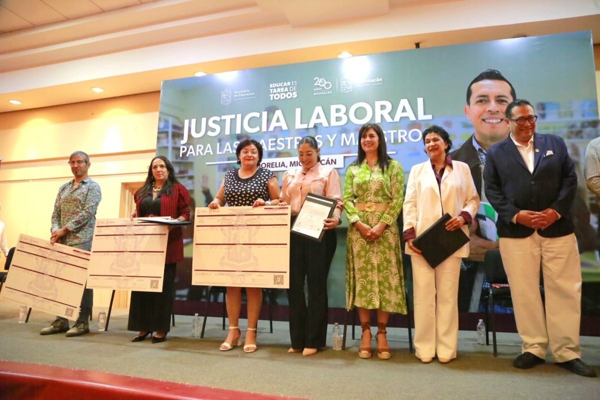 La secretaria de Educación, Gabriela Molina, destacó que la transformación educativa en Michoacán solo es posible si se hace de la mano con los docentes. “Tenemos maestras y maestros que tenían hasta 35 años trabajando para un nivel que no correspondía con su clave, eso les impedía participar en los procesos de promoción y los estancaba; ahora, gracias a la justicia laboral, recibieron su recategorización y podrán tener mejores oportunidades”, afirmó.