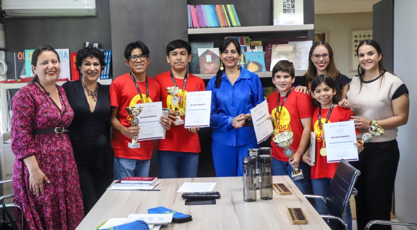 La titular de la Secretaría de Educación del Estado (SEE) felicitó a Santiago Castro Jiménez, Catalina Ruth Núñez Anaya, José Antonio Núñez Anaya y Emilio Santiago Barajas Ruiz, por su destacada participación en el certamen de habilidades matemáticas, que reunió a 600 estudiantes de 40 países.