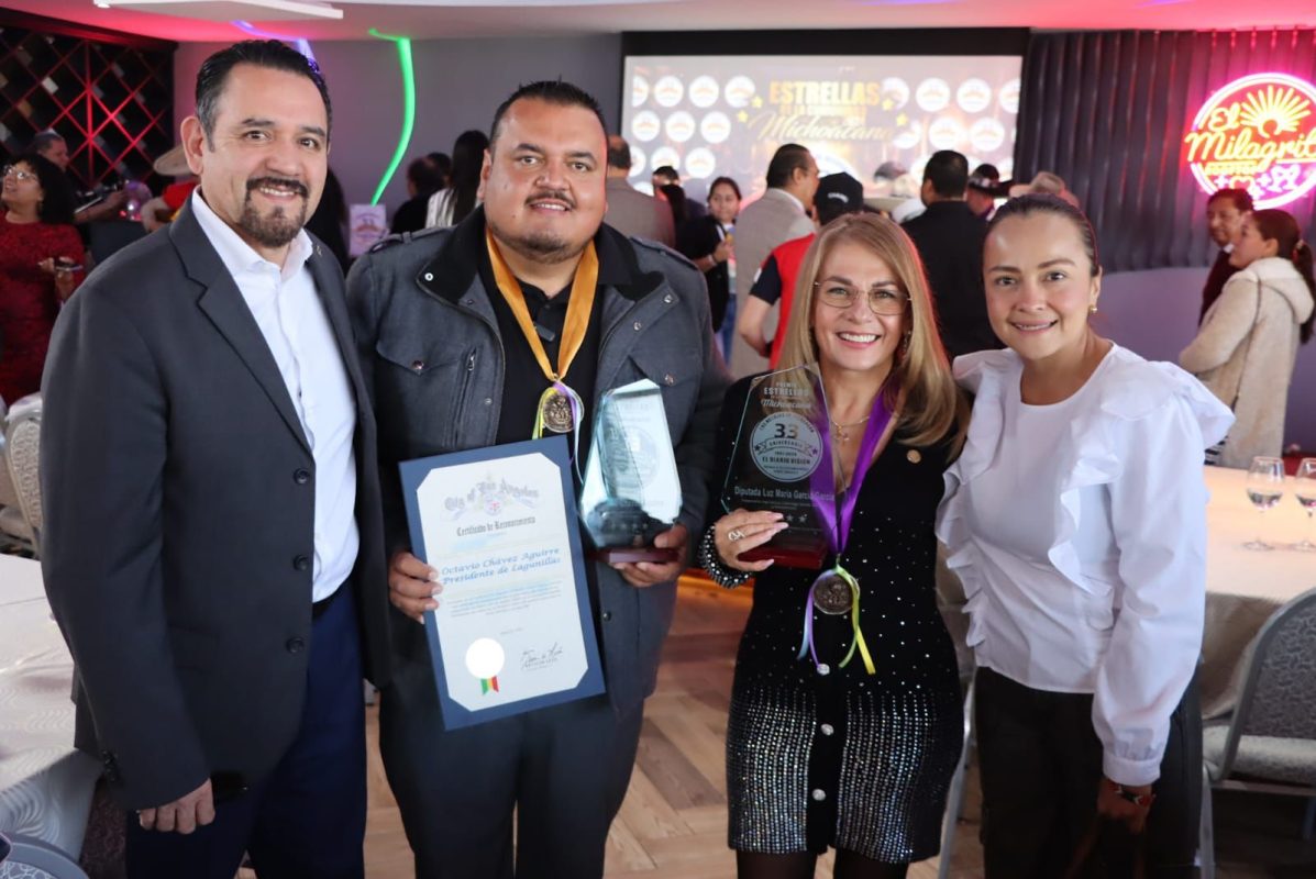 Morelia, Mich, a 21 de febrero de 2024.- La diputada Luz María García y el presidente municipal de Lagunillas Octavio Chávez Aguirre, del Partido Encuentro Solidario Michoacán (PES) fueron galardonados con el premio «Estrellas de la Comunidad Michoacana 2024», por su trayectoria legislativa, liderazgo social, altruista y humanitario.