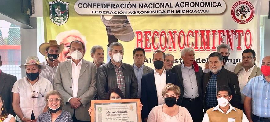Morelia, Mich., a 13 de Agosto de 2021.- Enmarcado dentro de los 100 años de haberse fundado la Federación Agronómica, los agrónomos de la entidad le entregaron un reconocimiento al maestro Julián Rodríguez Semas, quien fue uno de los principales pilares en la construcción de la Ley de Desarrollo Rural Sustentable.