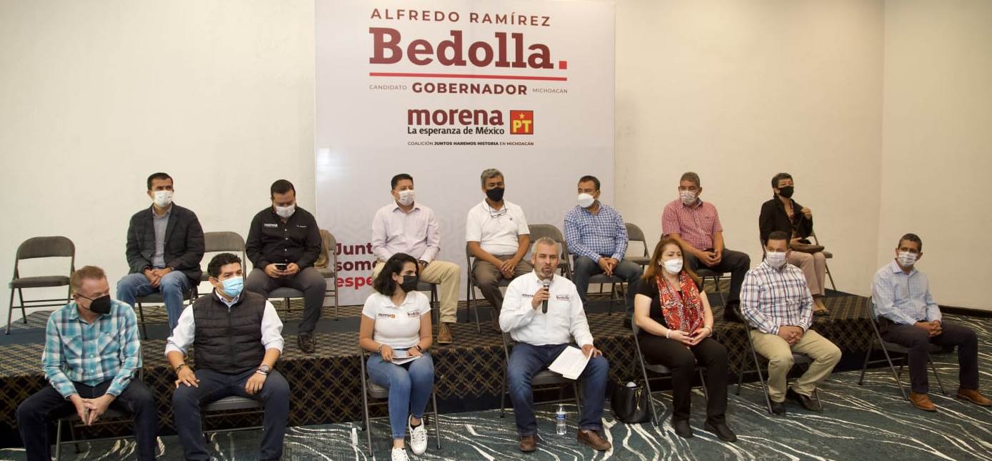 Morelia, Mich., 11 de Mayo del 2021.- A ocho días de haber iniciado campaña por la gubernatura, Alfredo Ramírez Bedolla afirmó que después de haber recorrido 21 municipios del estado su candidatura se ha fortalecido, porque «la alianza Morena-PT se mantiene unida y con mucha fuerza para ganar».