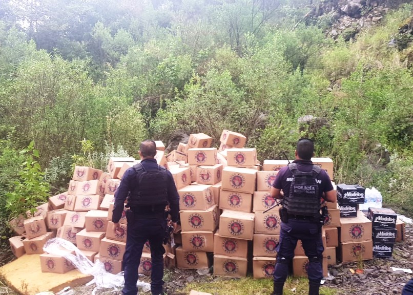 Sobre la carretera de Minsicuiran, perteneciente a la comunidad de Capácuaro, los uniformados observaron a un hombre a bordo de la unidad marca Internacional, línea Rabon, reportada como robada momentos antes, así como las 350 cajas de cerveza.