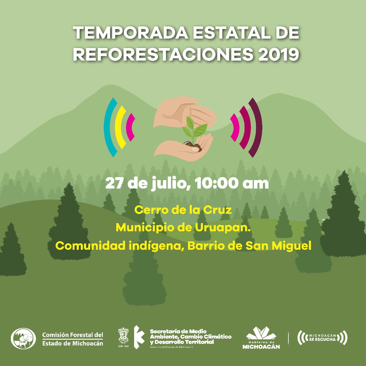 La intervención del Cerro de la Cruz será posible también, derivado de la coordinación con la Federación, mediante la Comisión Nacional Forestal (Conafor), la Procuraduría Federal de Protección al Ambiente (Profepa), las secretarías de Medio Ambiente y Recursos Naturales (Semarnat) y de Agricultura y Desarrollo Rural (Sader) y la Comisión Nacional del Agua (Conagua); el ayuntamiento de Uruapan; las diputadas Mayela Salas y Brenda Fraga; el Consejo Estatal de Ecología (Coeeco), y las comunidades indígenas de San Miguel y San Juan Bautista.