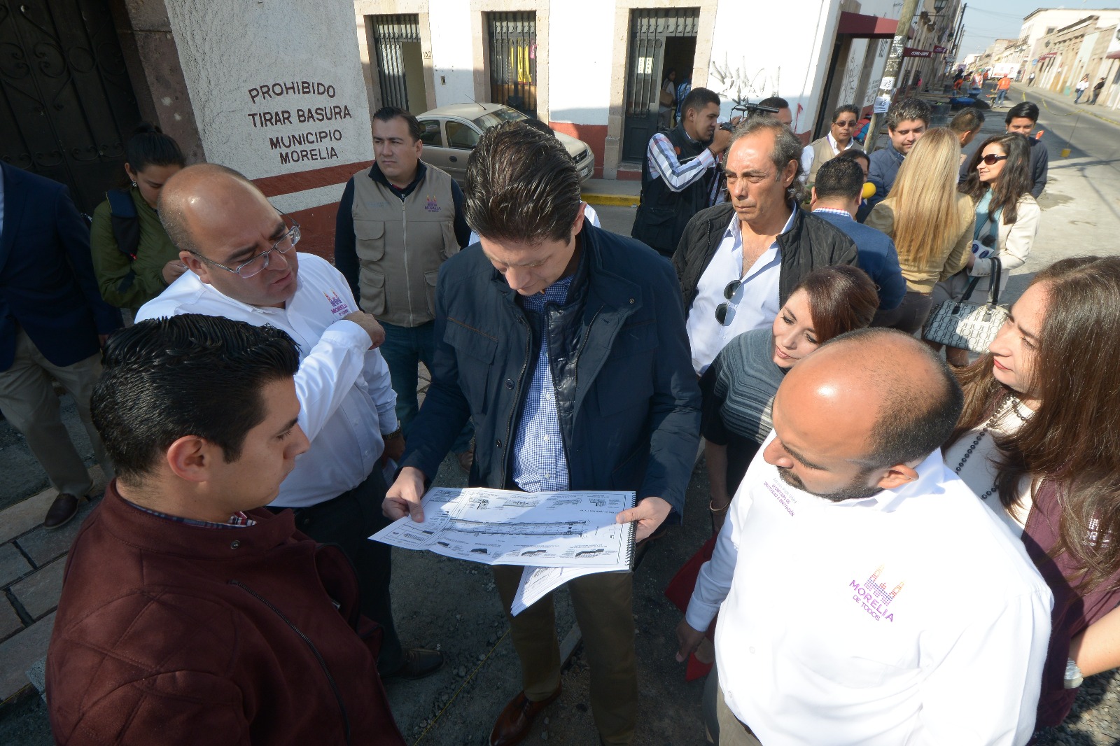 Morelia, Mich., 13 de febrero de 2017.-Firme en su compromiso de ofrecer espacios públicos dignos e incluyentes, que faciliten el desplazamiento de todos los sectores de la sociedad, el Presidente Municipal de Morelia, Alfonso Martínez Alcázar, realizó la supervisión de obra de Mejoramiento de banquetas de la calle Antonio Alzate, del Centro Histórico de esta capital.