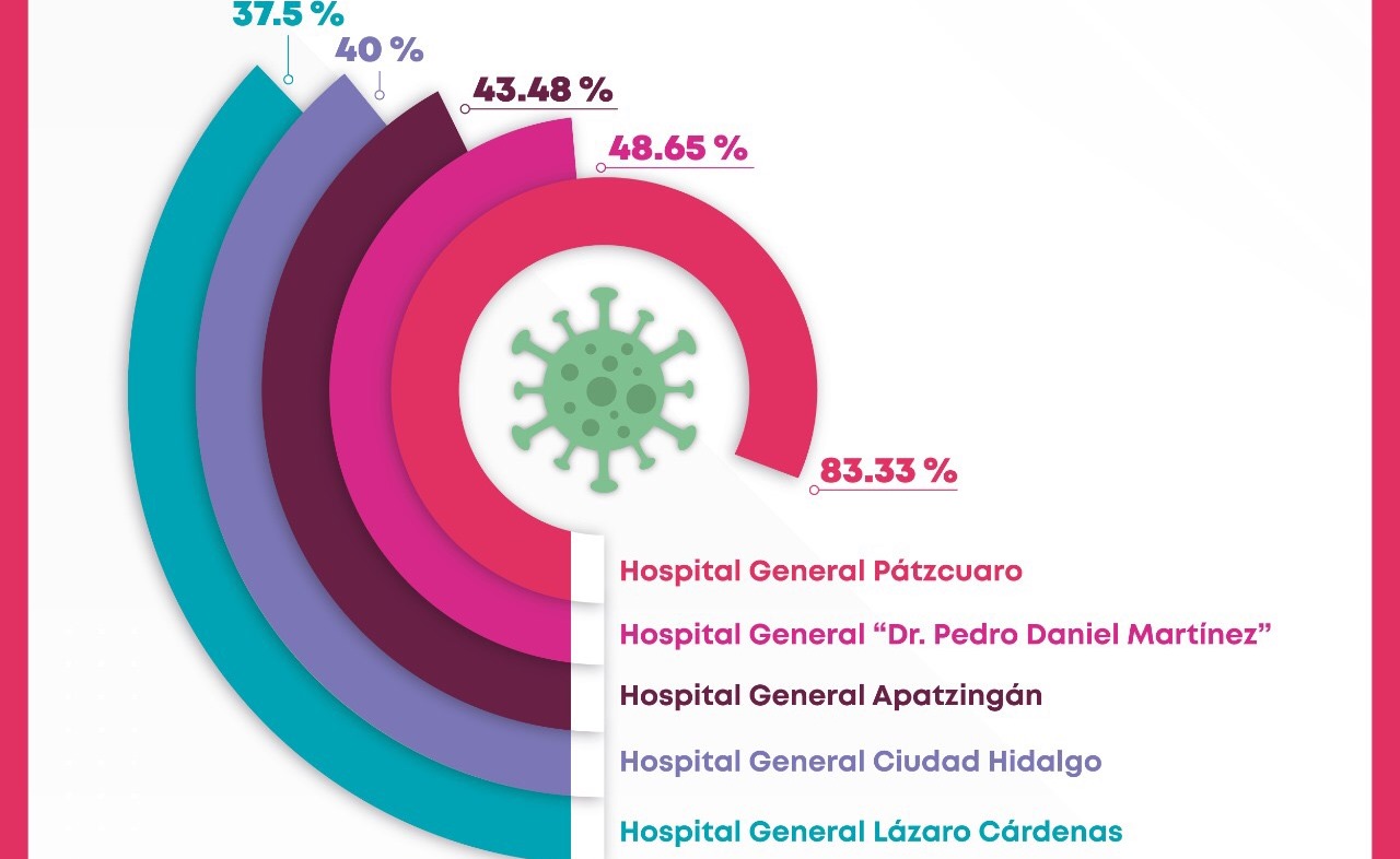 El Hospital General de Pátzcuaro, 83.33 por ciento; el de Uruapan, el Hospital General «Pedro Daniel Martínez», 48.65 por ciento; el Hospital General de Apatzingán, 43.48 por ciento; el Hospital General de Ciudad Hidalgo, 40 por ciento y el Hospital General de Lázaro Cárdenas, el 37.5 por ciento.