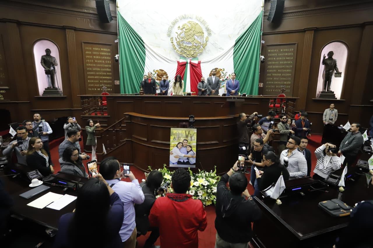 Morelia, Mich, a 4 de Febrero del 2026.- Previo al inicio de la sesión programada para este miércoles, diputadas y diputados integrantes de la 76 Legislatura, rindieron homenaje póstumo y guardaron un minuto de silencio por el sensible fallecimiento de Víctor Manuel Mujica Vega y Anayeli Hernández León, intérpretes de Lengua de Señas Mexicana y compañeros trabajadores de este Poder Legislativo, así como de su hija Megan Mujica Hernandez.