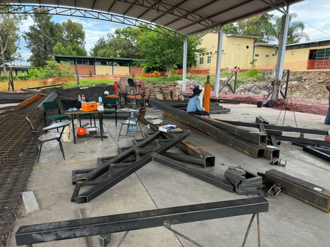 Con recursos del Fondo de Aportaciones Múltiples, la Dirección de infraestructura Educativa de la SCOP construye gradas, techumbre y comedores mediante la excavación, demolición de piedra y cimentación de zapatas para las ocho estructuras.