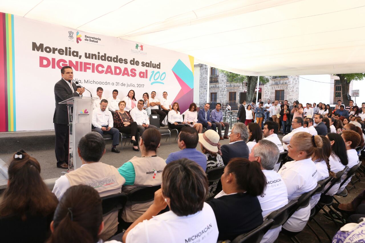 Lo anterior lo destacó al presidir el evento de entrega de la dignificación de 16 casas, módulos y Centros de Salud en el municipio de Morelia, con una inversión de 6.3 millones de pesos y que hoy son espacios dignos y bien equipados para los trabajadores y las y los pacientes michoacanos.