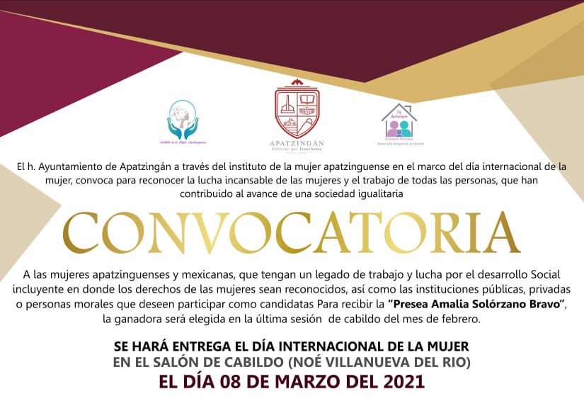 Apatrzingán, Mich., a 17 de Febrero de 2021.- El gobierno municipal, a través del Instituto Municipal del Mujer Apatzinguense (IMMA), amplío la convocatoria para la entrega de la Presea “Amalia Solórzano Bravo”, que se llevará a cabo el 8 de marzo próximo, con motivo del Día Internacional de la Mujer.