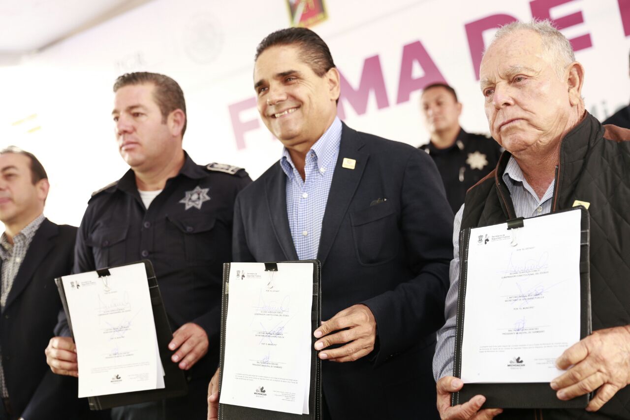 Tarímbaro, Mich., a 9 de julio de 2016.- El Gobernador Constitucional Silvano Aureoles Conejo, y el presidente municipal de Tarímbaro, Baltazar Gaona Sánchez, firmaron el convenio de Mando Único policial, con lo que suman ya 110 los ayuntamientos integrados a este esquema que coordina esfuerzos y recursos para fortalecer las tareas de seguridad en el territorio estatal.