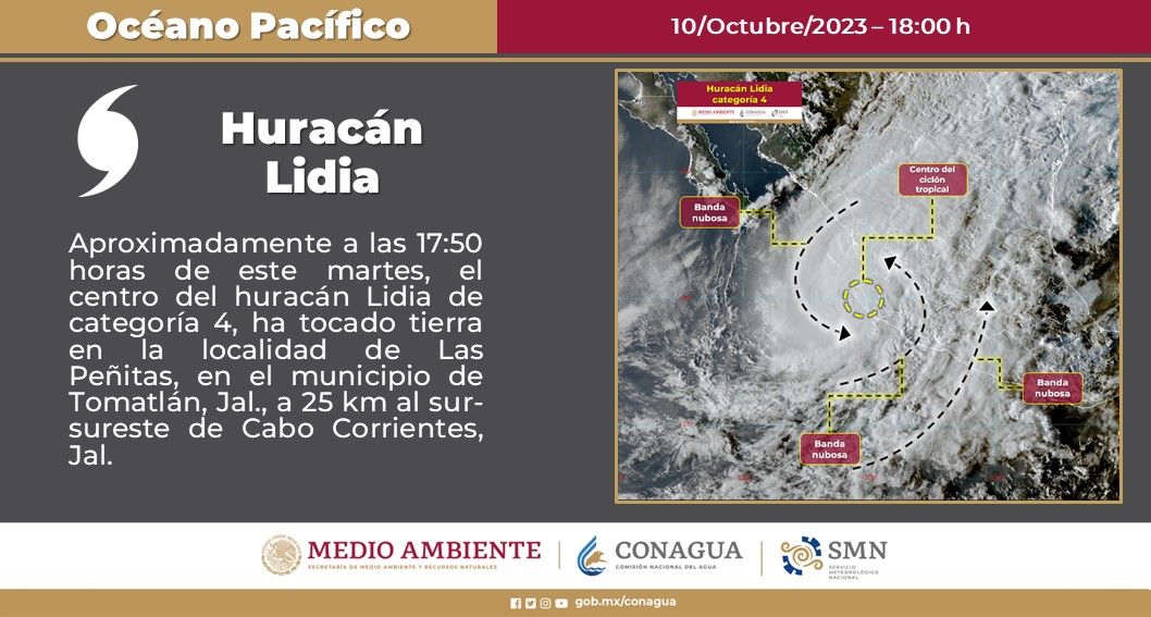 De acuerdo con la Comisión Nacional del Agua (Conagua), el huracán Lidia se localiza a 130 km al suroeste de Cabo Corrientes, y a 175 km al suroeste de Puerto Vallarta, Jalisco. Presenta vientos máximos sostenidos de 220 km/h y se desplaza al este-noreste a 26 km/h.