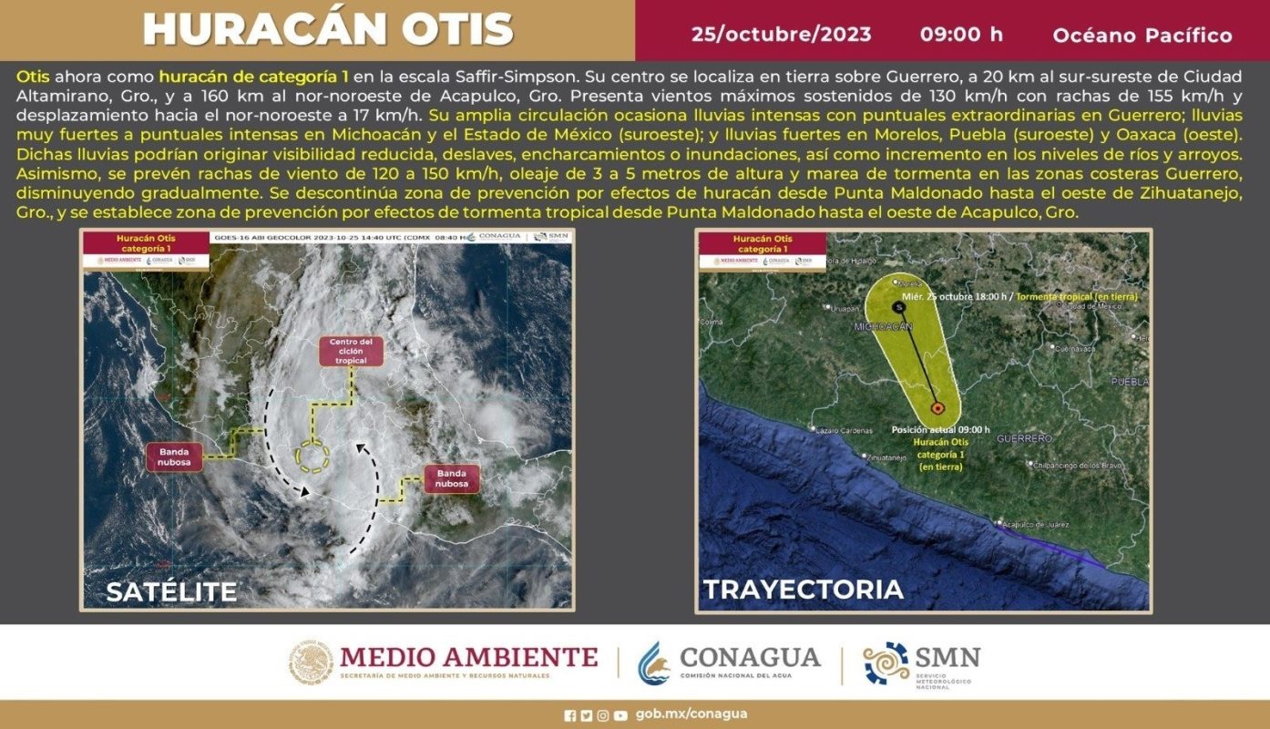 Morelia, Mich., 25 de Octubre de 2023.- La Coordinación Estatal de Protección Civil se mantiene en alerta ante el paso del huracán Otis, categoría 1, aunado a ello ya se encuentran listos 10 refugios temporales, ya que se prevén fuertes lluvias en las próximas horas.