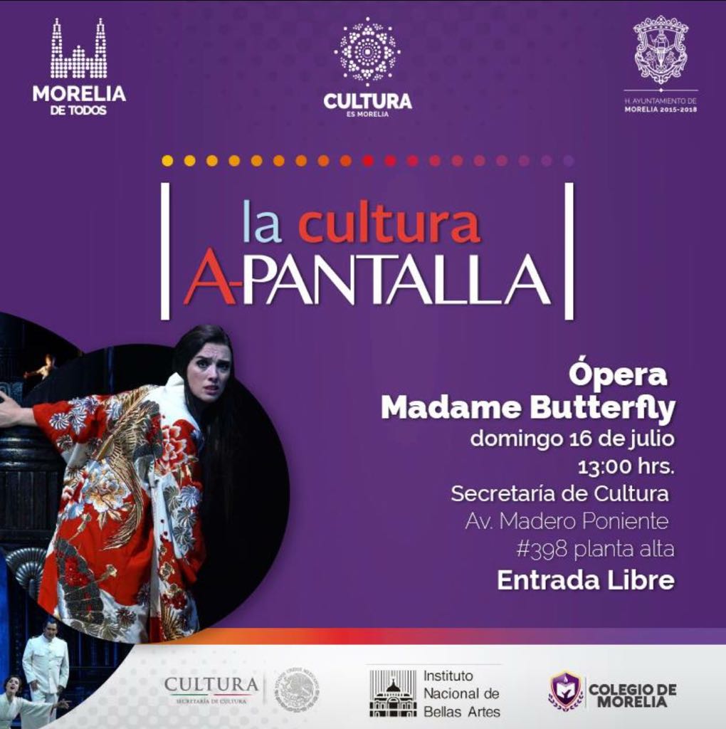 El Secretario de Cultura Municipal, Miguel Salmón del Real, recordó a la ciudadanía que “Madame Butterfly” representa el segundo espectáculo proyectado en Morelia del programa “la Cultura A-Pantalla”, impulsado por el Instituto Nacional de Bellas Artes (INBA), que ya presentó la re-transmisión de la Ópera “Carmen” de George Bizet.