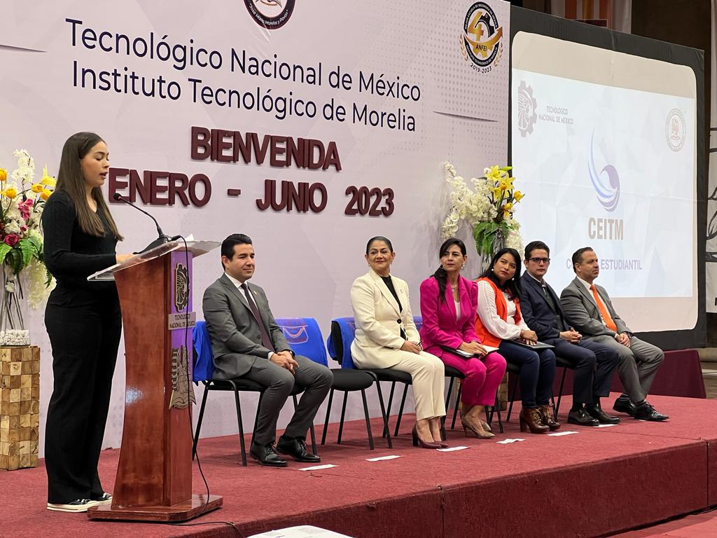 Morelia, Mich., a 10 de Febrero de 2023.- Con un llamado a permanecer en las aulas y culminar sus estudios, la secretaria de Educación en el Estado, Gabriela Molina Aguilar, dio la bienvenida a los jóvenes en el arranque de semestre del Instituto Tecnológico de Morelia.