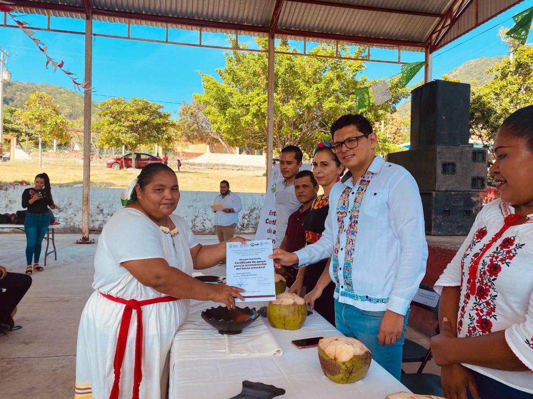 Cachán de Echeverría, municipio de Aquila, Mich., 25 de Noviembre de 2022.- Luego de las afectaciones que tuvo el sector artesanal de la Costa de Michoacán, tras el sismo del 19 de septiembre del año en curso, el Instituto del Artesano Michoacano (IAM) y la Secretaría de Desarrollo Económico (Sedeco) hicieron entrega del certificado de apoyo económico para la reconstrucción de ocho hornos alfareros.