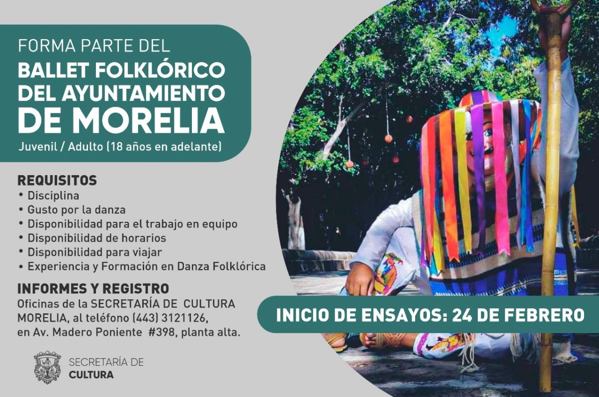 Morelia, Mich., a 21 de Febrero del 2022.- La Secretaría de Cultura de Morelia (SeCultura), convoca a todas y todos los interesados en preservar, difundir y proyectar las tradiciones dancísticas de la entidad, a formar parte de la primera generación del Ballet Folklórico del Ayuntamiento de Morelia.