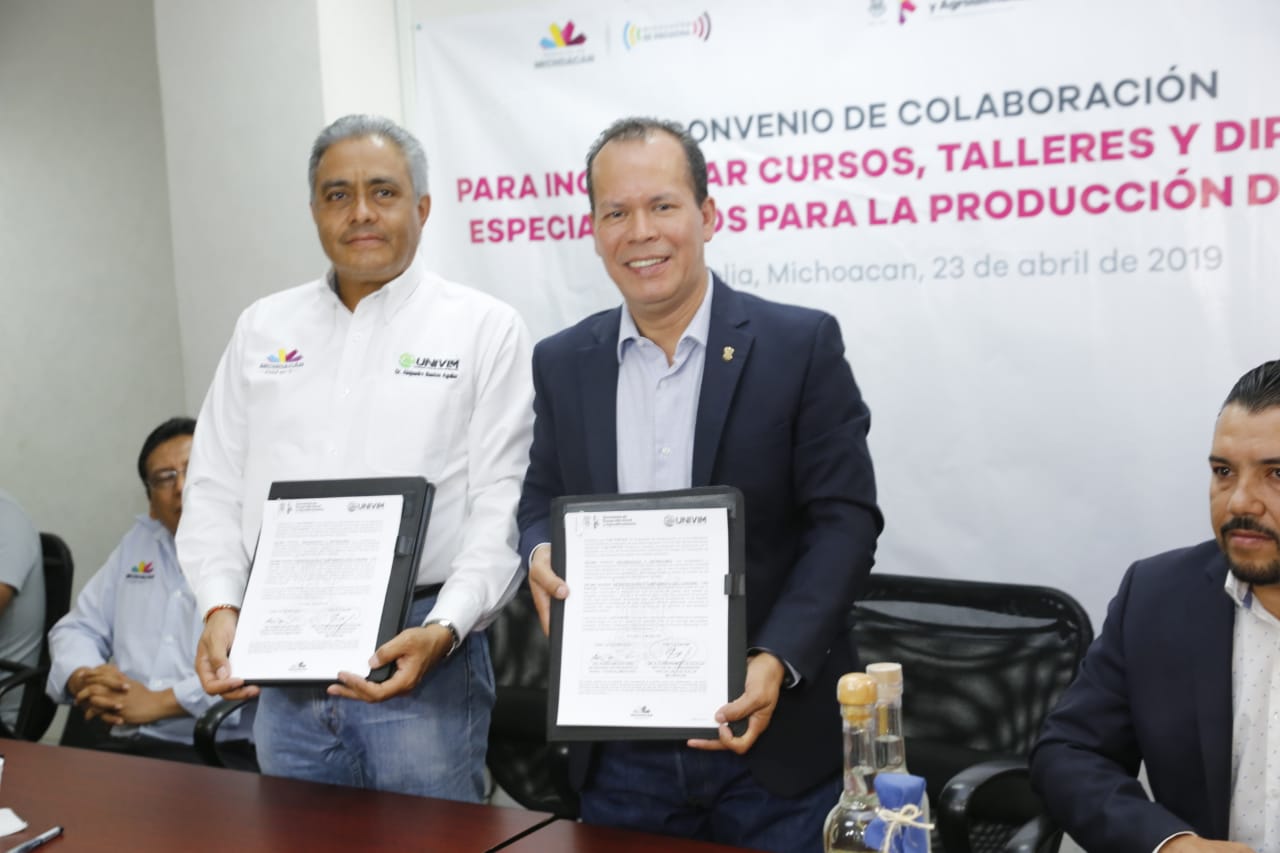 Morelia, Michoacán, 23 de abril de 2019.- Con el propósito de mejorar la producción de mezcal, al profesionalizar a las y los productores michoacanos, la Secretaría de Desarrollo Rural y Agroalimentario (Sedrua), y la Universidad Virtual del Estado (Univim), firmaron un convenio de colaboración para llevar a cabo doce cursos, tres diplomados y una especialidad en la materia.