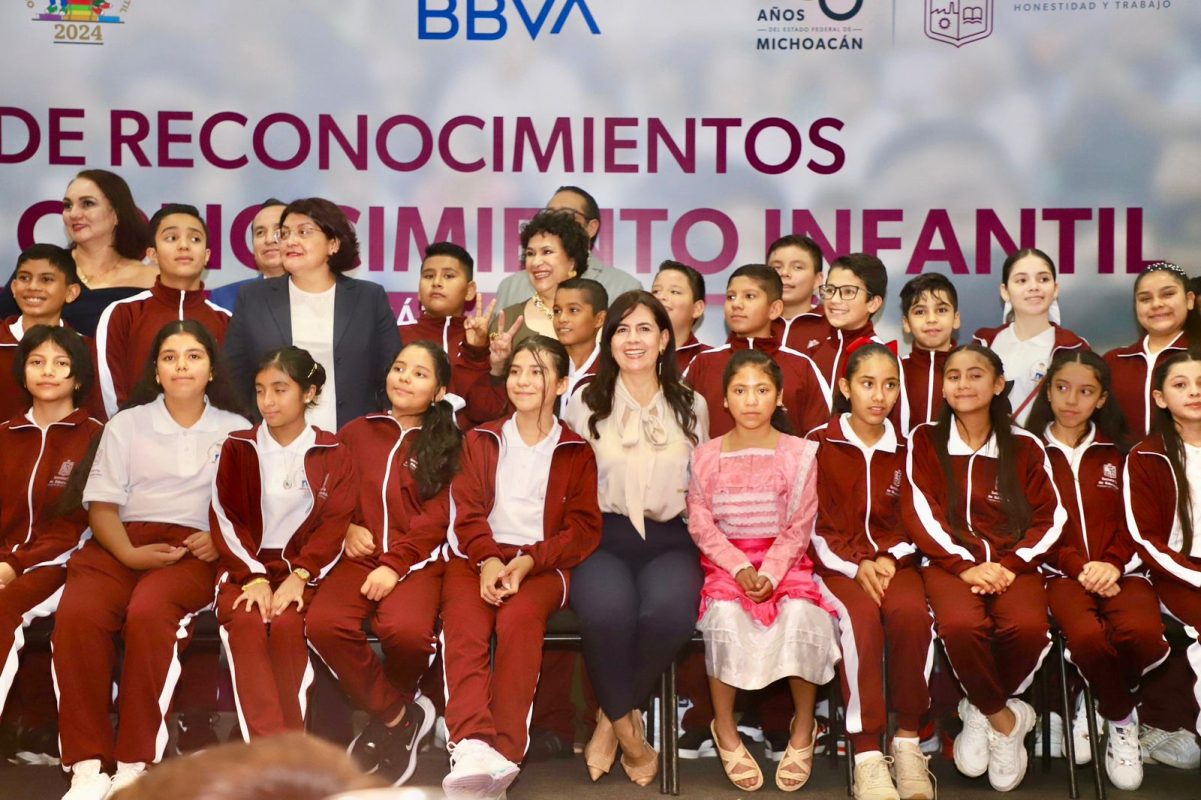 Morelia, Mich., 16 de Julio de 2024.- Gracias a su excelencia educativa, 53 niñas y niños ganadores de la Olimpiada del Conocimiento Infantil 2024 recibieron su reconocimiento, computadora y más herramientas escolares por parte de la Secretaría de Educación del Estado (SEE), además de becas para continuar su formación en la secundaria, por parte de la Fundación BBVA.
