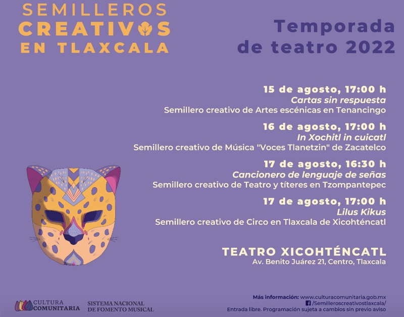 Tlaxcala a 12 de agosto de 2022.– El Teatro Xicohténcatl, uno de los escenarios más importantes del estado de Tlaxcala, será la sede de la Temporada de Teatro de los Semilleros creativos -grupos de creación y formación artística comunitaria para niñas, niños y jóvenes- de este estado, del lunes 15 al miércoles 17 de agosto.