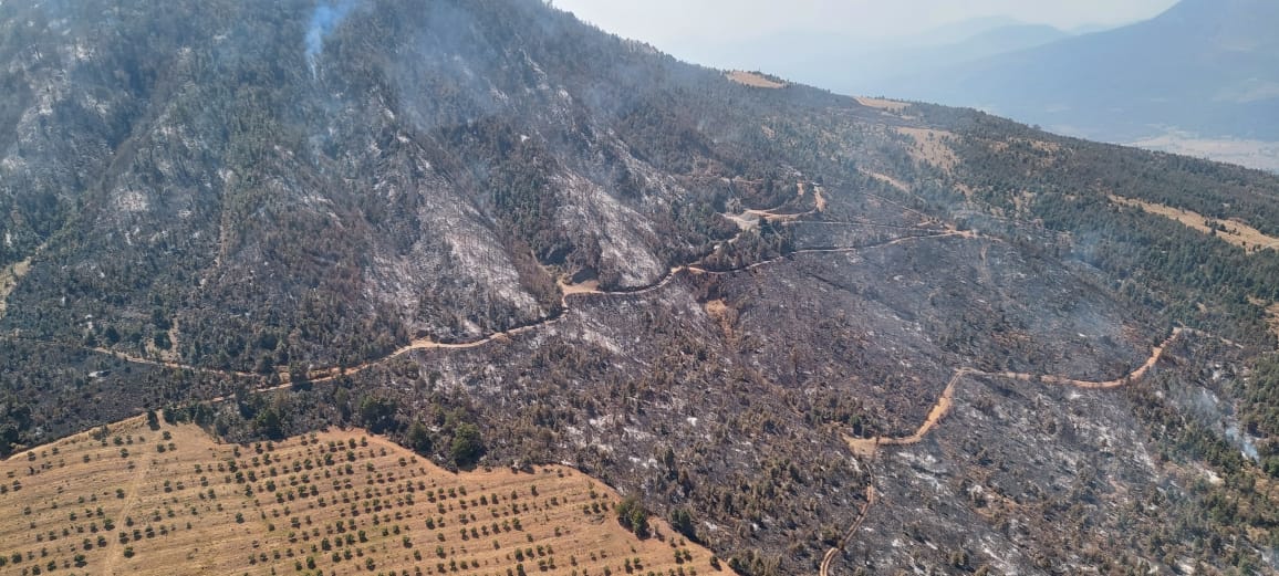 De acuerdo con el Centro Estatal de Manejo del Fuego, brigadistas de la Cofom, Comisión Nacional Forestal (Conafor), Ayuntamientos y voluntarios continúan los trabajos por tierra para la liquidación del fuego, realizando brechas corta fuego así como líneas negras para evitar que el siniestro avance.