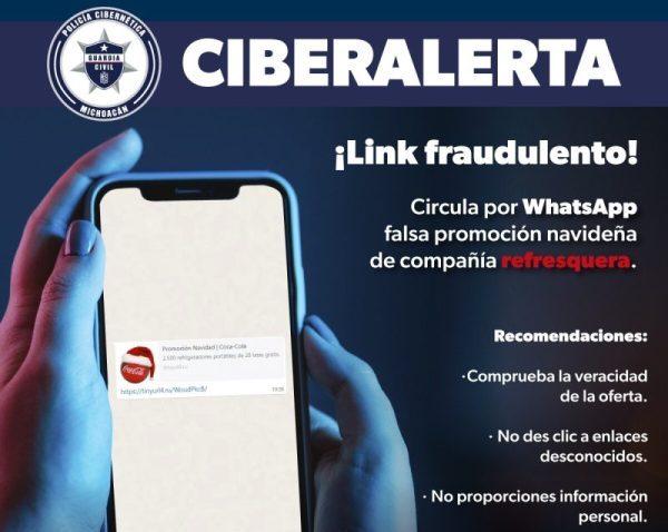 Morelia, Mich., a 21 de diciembre del 2022.- Debido a un malware que ronda en las redes sociales, sobre una promoción navideña de la empresa refresquera Coca-Cola y que puede vulnerar gravemente la privacidad de las y los michoacanos, el personal de la Secretaría de Seguridad Pública (SSP) a través de la Policía Cibernética, informa sobre este potencial problema y emite una serie de recomendaciones.