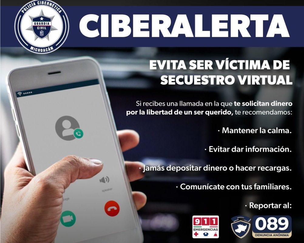Morelia, Mich., a 31 de Enero del 2023.- En aras de mantener una población segura y de trabajar en coordinación para la prevención de ilícitos, los agentes de la Secretaría de Seguridad Pública (SSP), emiten una serie de recomendaciones para evitar que las y los michoacanos puedan ser víctimas del delito de secuestro virtual.