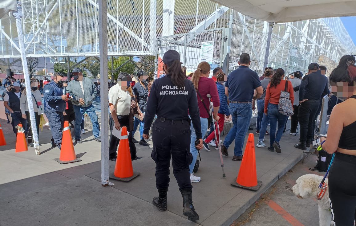 Morelia, Mich., a 22 de Enero del 2022.- A través de la presencia policial, los elementos de la Secretaría de Seguridad Pública (SSP) garantizan la seguridad y tranquilidad en los módulos de vacunación contra Covid-19 implementados por la Secretaría de Salud de Michoacán (SSM) en Morelia.Por instrucciones del secretario de Seguridad Pública del estado, General José Alfredo Ortega Reyes, los elementos de la Policía Michoacán han mantenido presencia en los módulos y calles aledañas del estadio Venustiano Carranza desde las primeras horas del día.En estrecha coordinación con las autoridades sanitarias, los agentes policiales supervisan el orden y la tranquilidad; asimismo, protegen la integridad del personal de las brigadas así como de los ciudadanos que acuden a la inmunización.Ante cualquier situación de emergencia suscitada al momento de presentarse para la aplicación de la citada vacuna, acude ante la autoridad policial más cercana o llama a los números de emergencias 911 y 089.