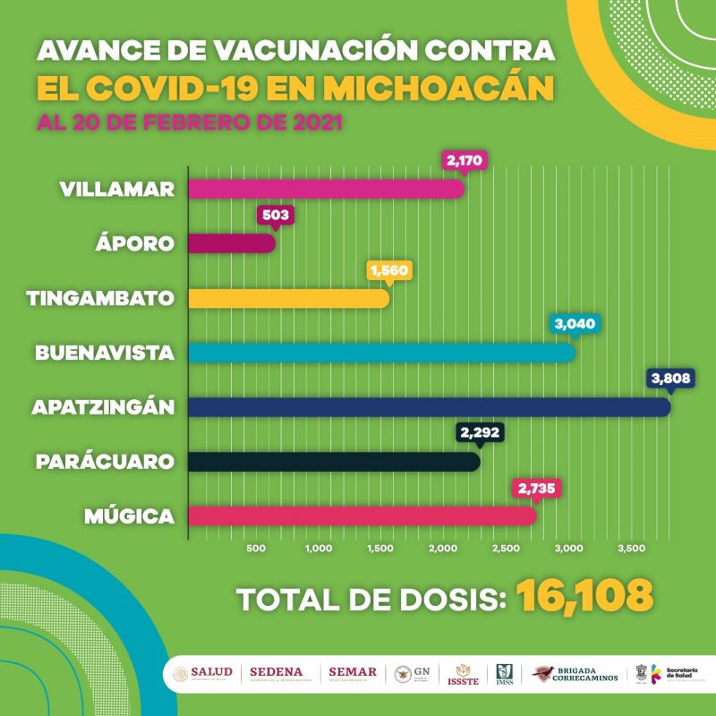 Se han aplicado dos mil 170 en Villamar, 503 en Áporo, mil 550 en Tingambato, tres mil 40 en Buenavista, tres mil 808 en Apatzingán, dos mil 292 en Parácuaro y dos mil 735 en Múgica.