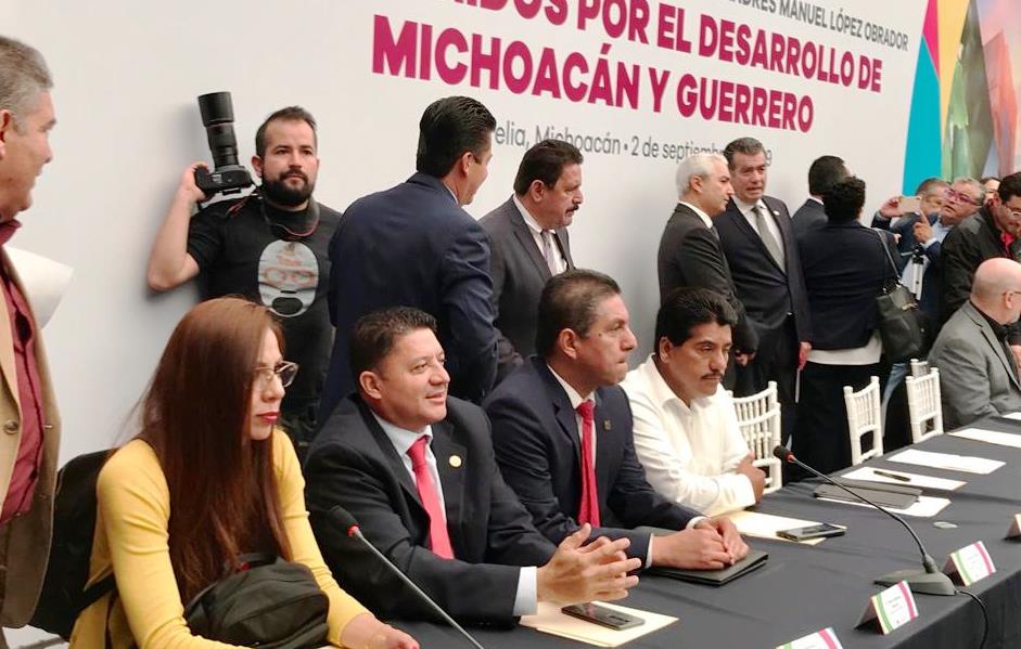 Previo a la firma del acuerdo, denominado como “Todos Unidos por Desarrollo de Michoacán y Guerrero, legislador se sumó al respaldo que desde la plaza Benito Juárez de Morelia, se brindó hacia el presidente López Obrador, por parte del dirigente estatal del Movimiento de Regeneración Nacional (Morena), Sergio Pimentel.