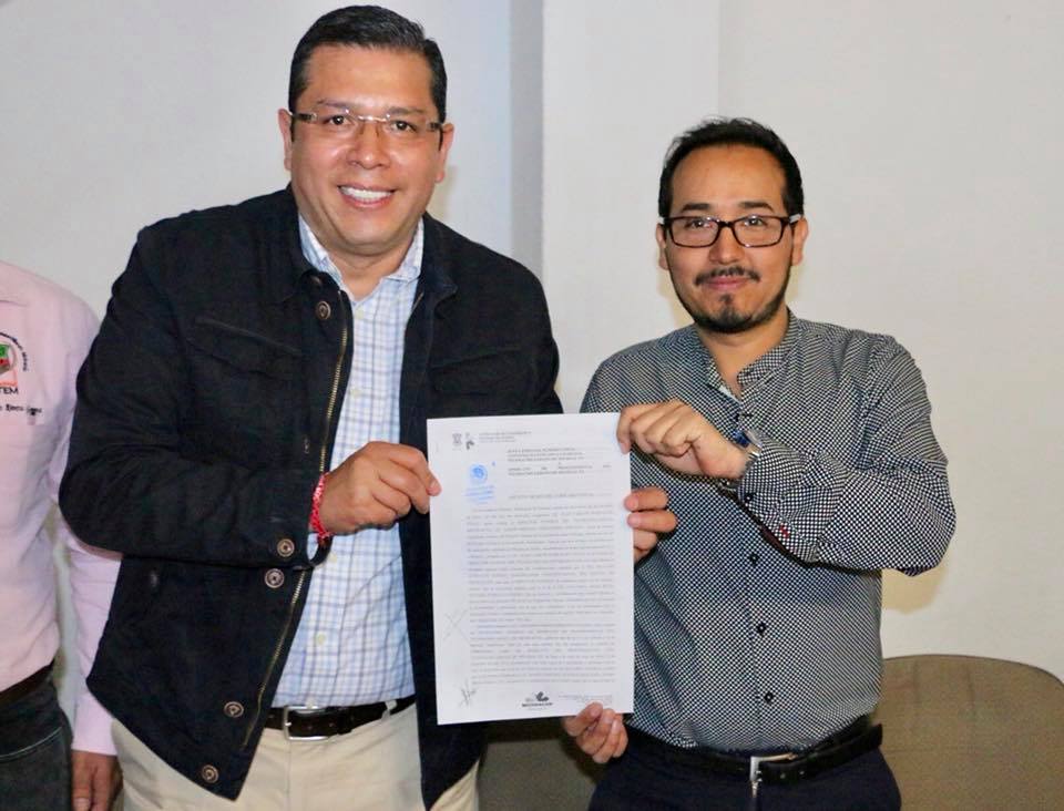 Morelia, Michoacán, a 16 de marzo de 2018.- Ante la Junta Local de Conciliación y Arbitraje (JLCA), el director general del Telebachillerato Michoacán, Juan Carlos Barragán Vélez, y el secretario general del Sindicato de Profesionistas del subsistema, Armando Simón Herrejón Solorio, signaron un convenio para atender las demandas de los integrantes del gremio.