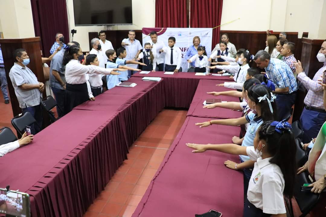 Apatzingán, Mich., a 29 de Abril del 2022.- Niños y niñas estudiantes de primaria rindieron protesta como integrantes del Cabildo Infantil Incluyente 2022, en su primer mensaje el presidente infantil, Oswaldo Virrueta Céspedes, felicitó a sus compañeros síndico y regidores además les pidió ocuparse de los temas relacionados con los derechos humanos de la niñez de Apatzingán.