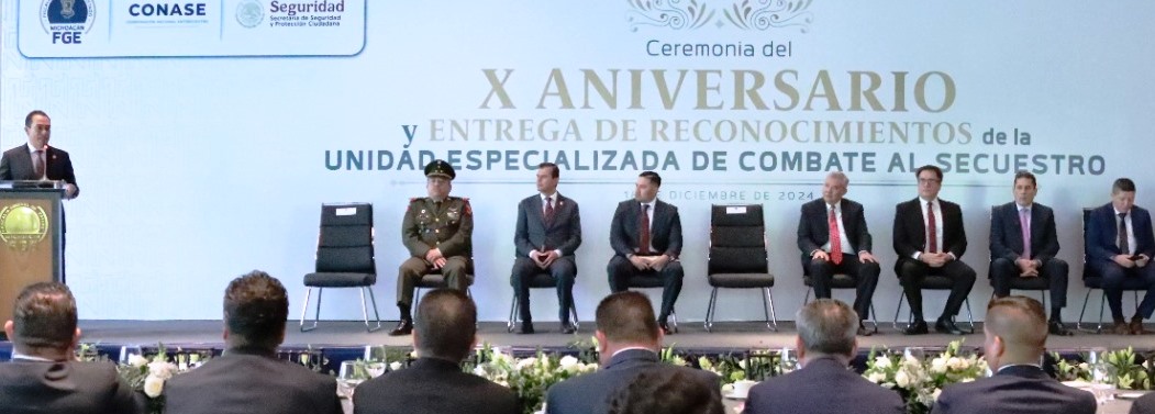 En su intervención, el titular de la Coordinación Nacional Antisecuestro (CONASE), Antonio de Jesús Lozada González, tras felicitar a la UECS por la incansable labor que ha realizado a lo largo de una década de intenso servicio público en favor de las y los michoacanos, señaló que la fórmula para afrontar los delitos de secuestro y extorsión debe ser el fortalecimiento a la inteligencia en la investigación y una absoluta coordinación entre el gabinete de seguridad federal y las entidades federativas, por lo que refrendó el respaldo de la federación de brindar los recursos necesarios para llevar a cabo estas labores. Asimismo, exhortó al personal de la UECS a abordar el combate a estos delitos desde una postura sensible y empática con las víctimas, a fin de reconstruir la percepción de la imagen de cada una de las corporaciones encargadas de perseguir a los infractores de estos actos.