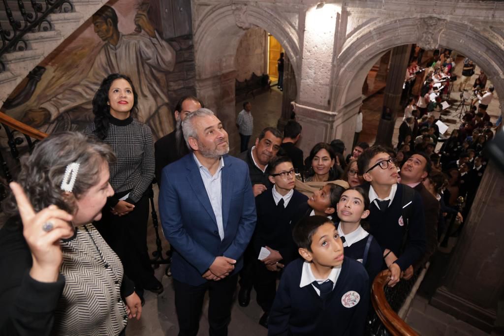 Morelia, Mich., , 19 de Noviembre de 2023.- Se realizó el primer recorrido guiado por las instalaciones de Palacio de Gobierno a alumnas y alumnos de las secundarias federal no. 2 y la técnica no. 150 que acompañaron al gobernador Alfredo Ramírez Bedolla en el arranque del programa Un Palacio para el Pueblo.