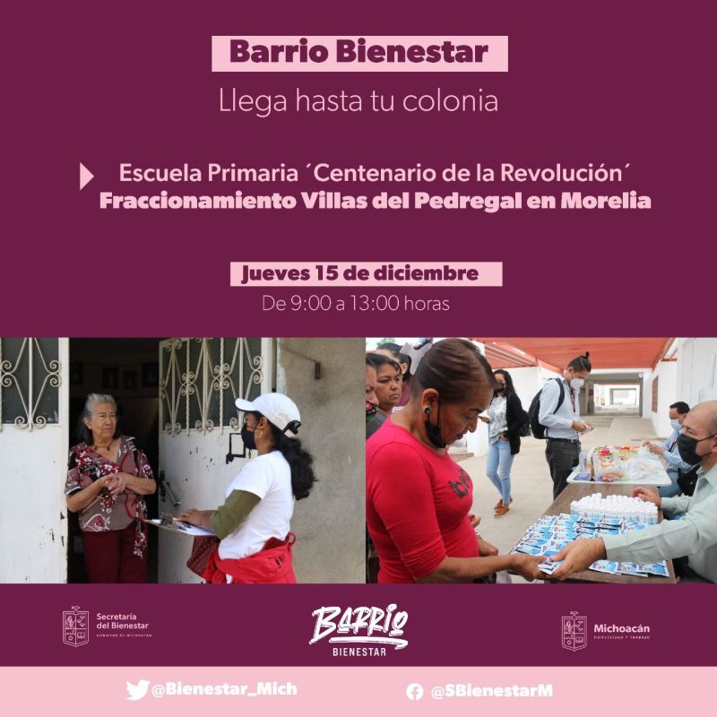 Morelia, Mich., a 14 de diciembre del 2022.- El Fraccionamiento Villas del Pedregal será la sede de la última jornada de intervención comunitaria por parte de las brigadas de Barrio Bienestar, así lo anunció Carolina Rangel Gracida, secretaria del Bienestar (Sedebi) del Gobierno de Michoacán.