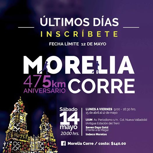Morelia, Mich., a 10 de Mayo del 2016.,- Este jueves 12 de mayo vence el plazo de inscripción para participar en la carrera nocturna denominada “Morelia Corre”, misma que es impulsada por el Ayuntamiento de Morelia a través del Instituto de la Juventud Moreliana, como parte de las actividades conmemorativas al 475 aniversario de fundación de la ciudad de la cantera rosa.