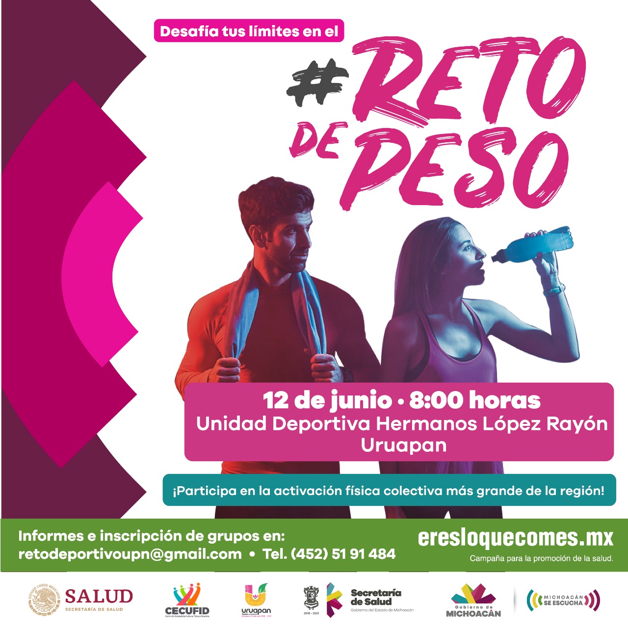 El Gobierno del Estado, a través de la Secretaría de Salud (SSM), y de la Comisión Estatal de Cultura Física y Deporte (Cecufid), convoca a la población de este municipio y demarcaciones vecinas a participar en esta segunda etapa de la campaña “Eres lo que Comes”, enfocada a crear estilos de vida saludable entre las familias de Michoacán.