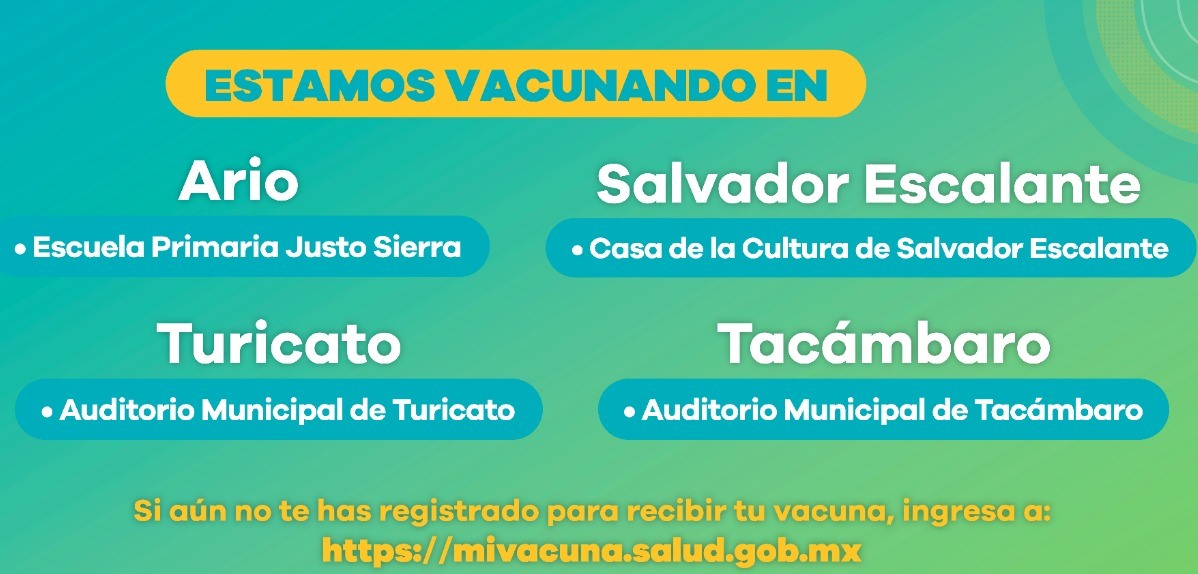 En Ario, Salvador Escalante, Turicato y Tacámbaro, se mantiene activa la vacunación este domingo.